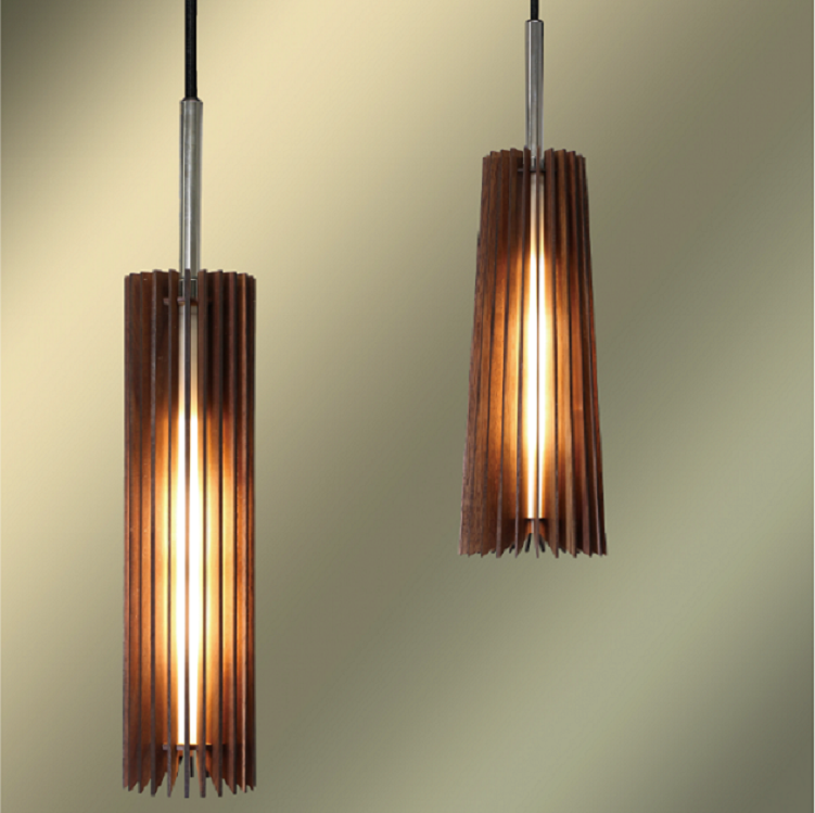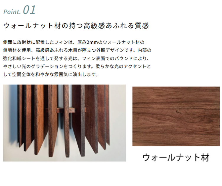 世界3大銘木の一つであるウォールナット材の薄板をランプから放射状に並べたスリムスタイルのペンダントライトです。