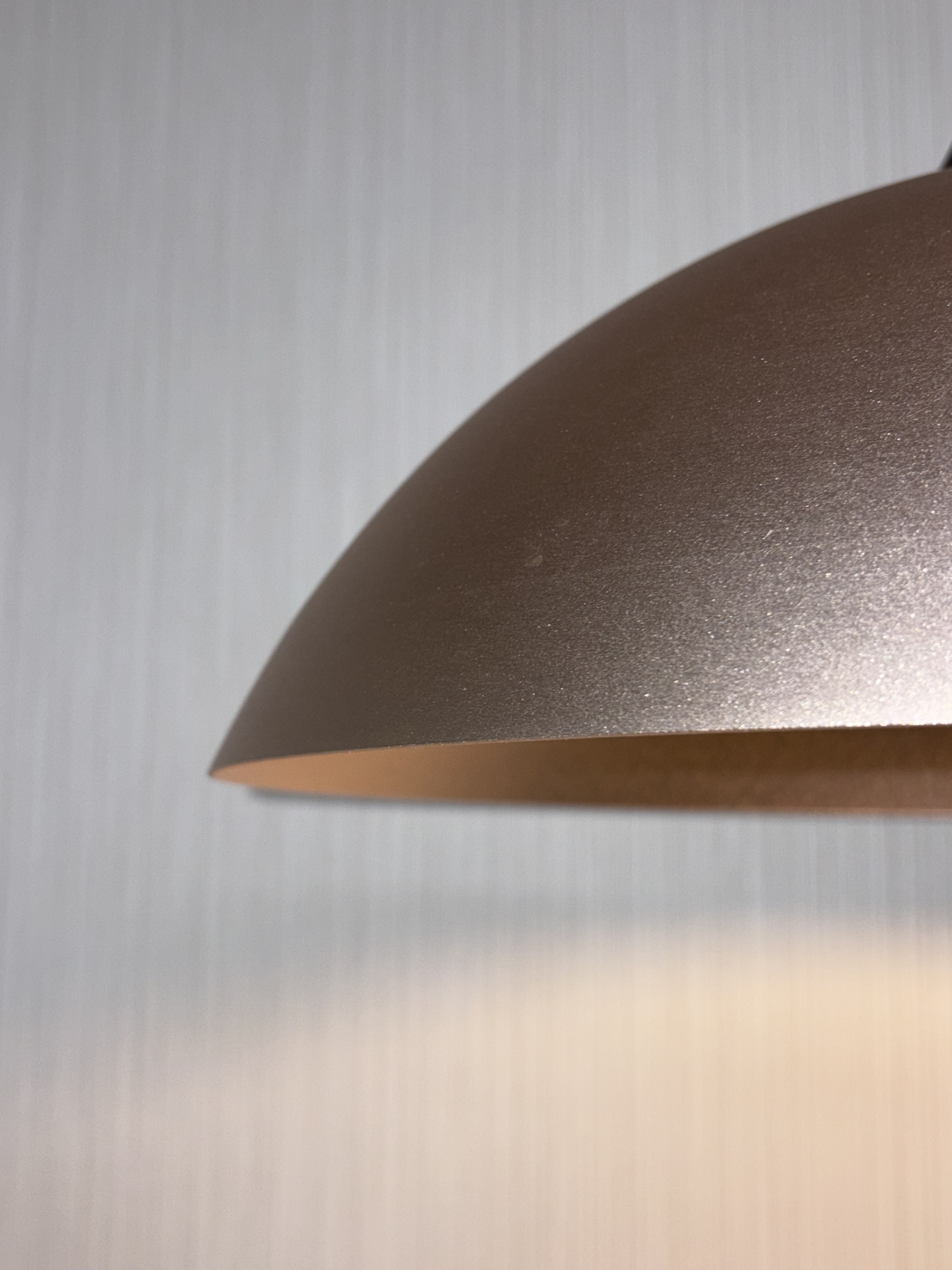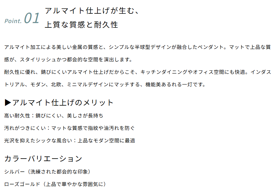 アルマイト加工による美しい金属の質感と、シンプルな半球型デザインが融合したペンダント。