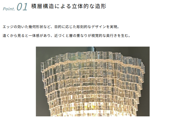 光源が内部から拡散し、積層ラインごとに揺らぎや陰影を纏う様は、静けさと躍動感が同居する現代的な光のオブジェです。